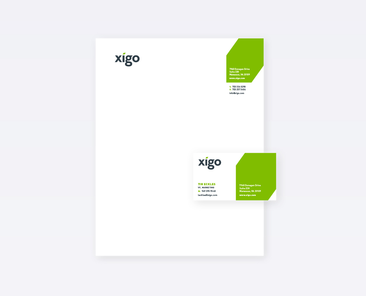 Rebranding for Xigo, a communications management platform. Full rebrand included design of an identity, website, stationery and print materials, trade show graphics, and brand guidelines, all focused on showing momentum and movement while clarifying a complex suite of offerings.